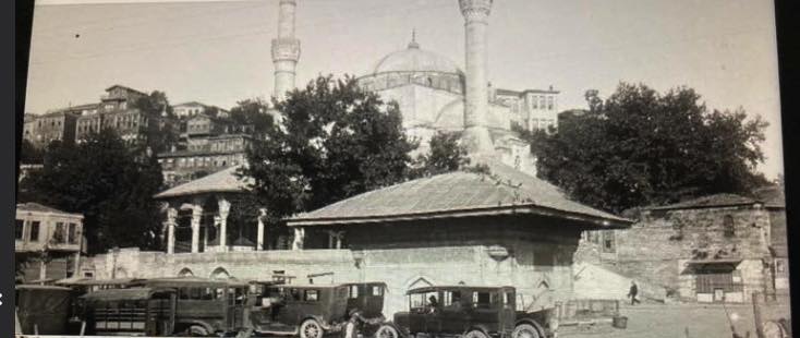 Mehmet Güntekin’in gönderdiği resim. Yıl 1930’lar. Sağ arkada görülen benzinci kapalı. Müşterisi olan taksiler III. Ahmet çeşmesi önünde kuyrukta. Gelecek vapuru bekliyorlar. Yürüyen kişi acaba benzinciyi kapatıp evine giden Asım olabilir mi?